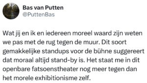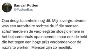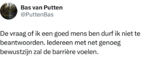 Vandaag moest ik daar weer aan denken toen ik een (re)tweet van Eva Hoeke zag. Ze poste de visie van Bas van Putten in screenshots. Bijna vloeibaar geschreven, zo goed. Bovendien sloot zijn analyse naadloos aan op mijn veranderde beeld over stelligheid in het algemeen en met betrekking tot de enkeling in het bijzonder.
